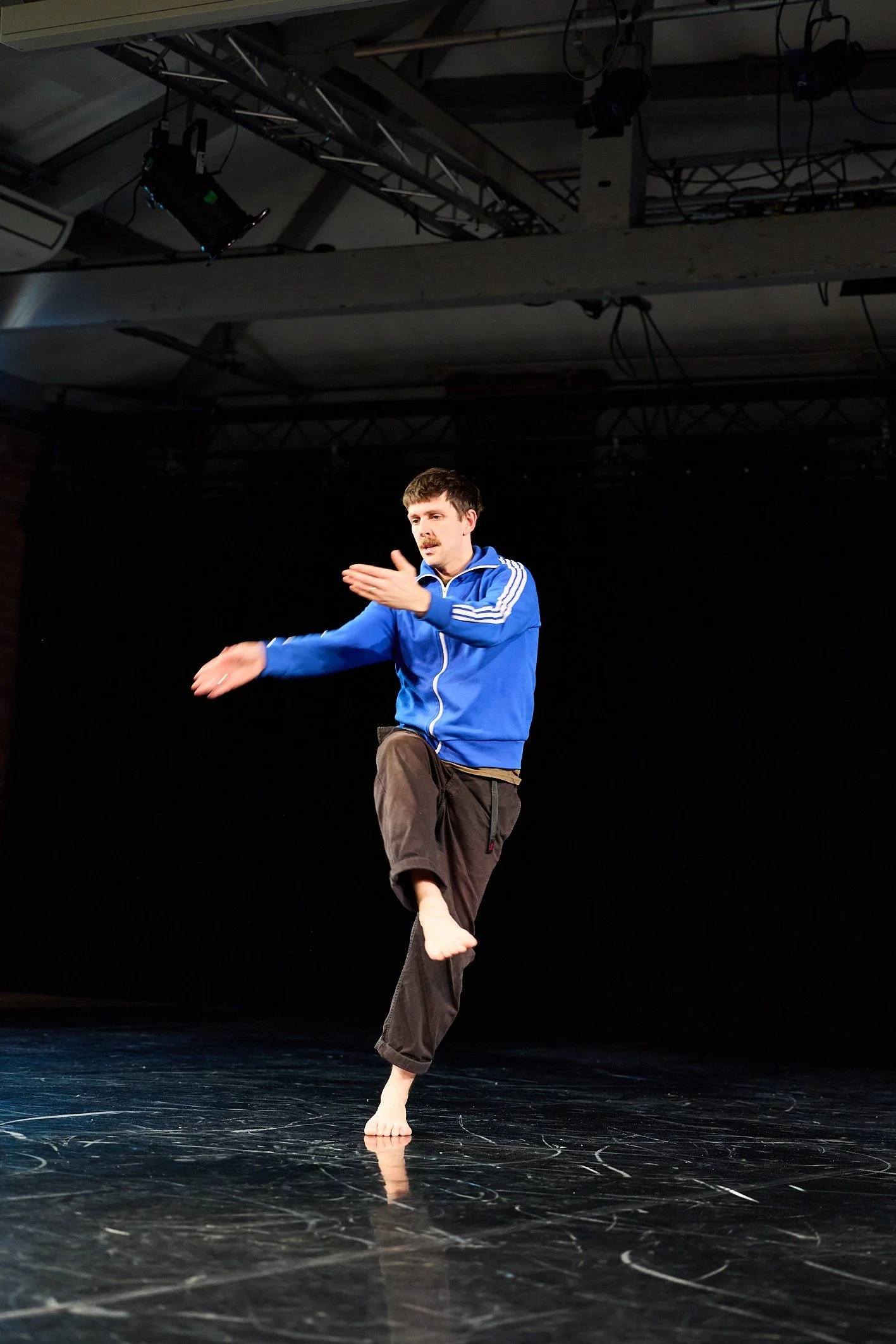 The work, at the moment, consists of three main elements, a complex dance at the beginning, a fall towards the middle and then a long monologue delivered from where I land on the floor, which dwells on who is to blame for the fall, asks everyone present to remember a better time, (specifically the time that I was up on my feet dancing) and veers off into other associative rambling which complicates the relationship & examines power dynamics between the performer, the audience and this event that we all shared in, touching on themes of failure, decline and nostalgia.